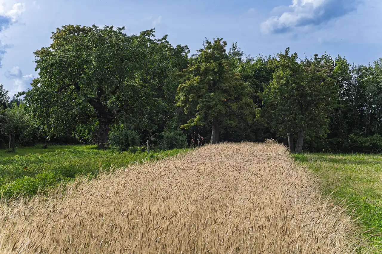 Wandelgrund lies slightly off Saalhausener Straße, behind a rusty gate, accessible only via a dirt track. The site covers about two and a half hectares with a farmhouse, utility buildings, barns, orchards, vegetable plots and small grain fields, where perennial rye is growing among other crops. Historically, the place goes back to “Wiesengrund”, a small “Gärtnerhof”-type farm that was managed by the Ludewig family during the GDR period and beyond.​
