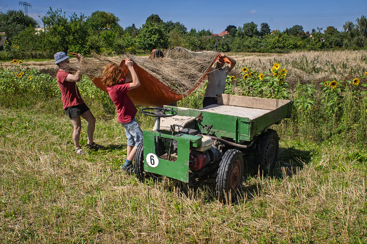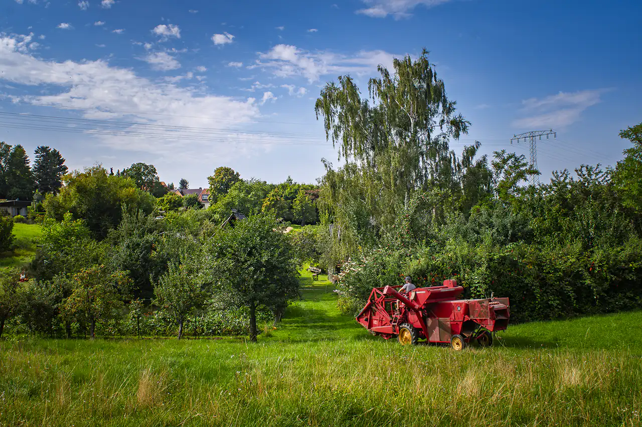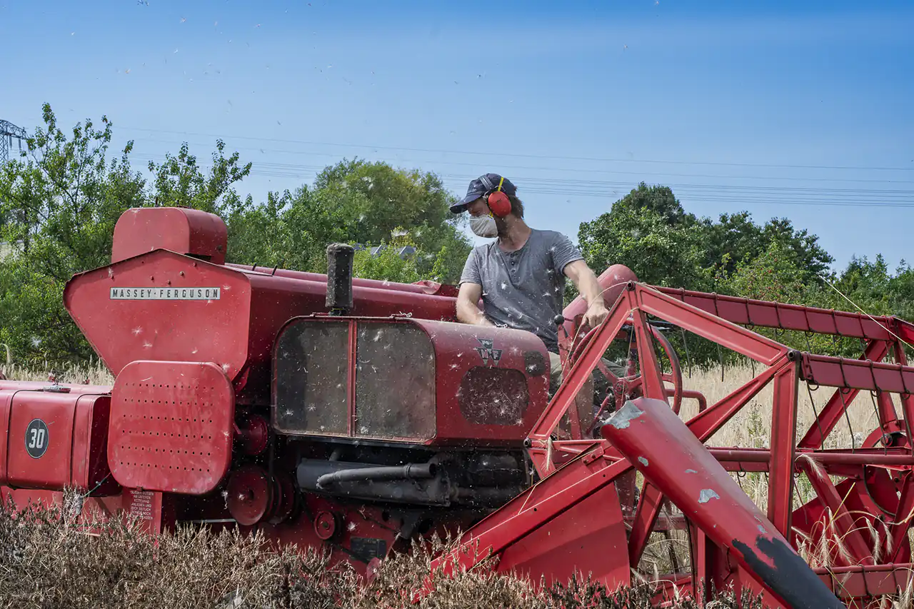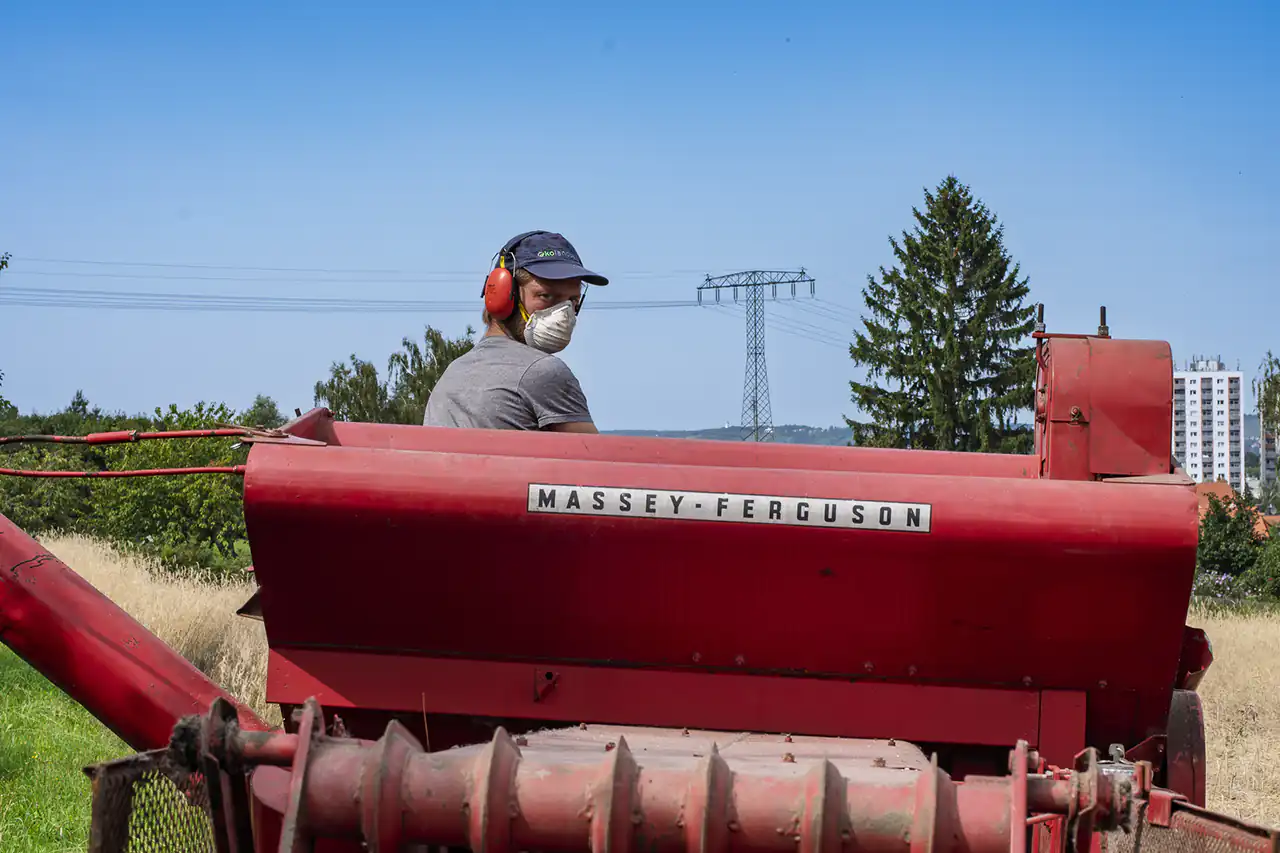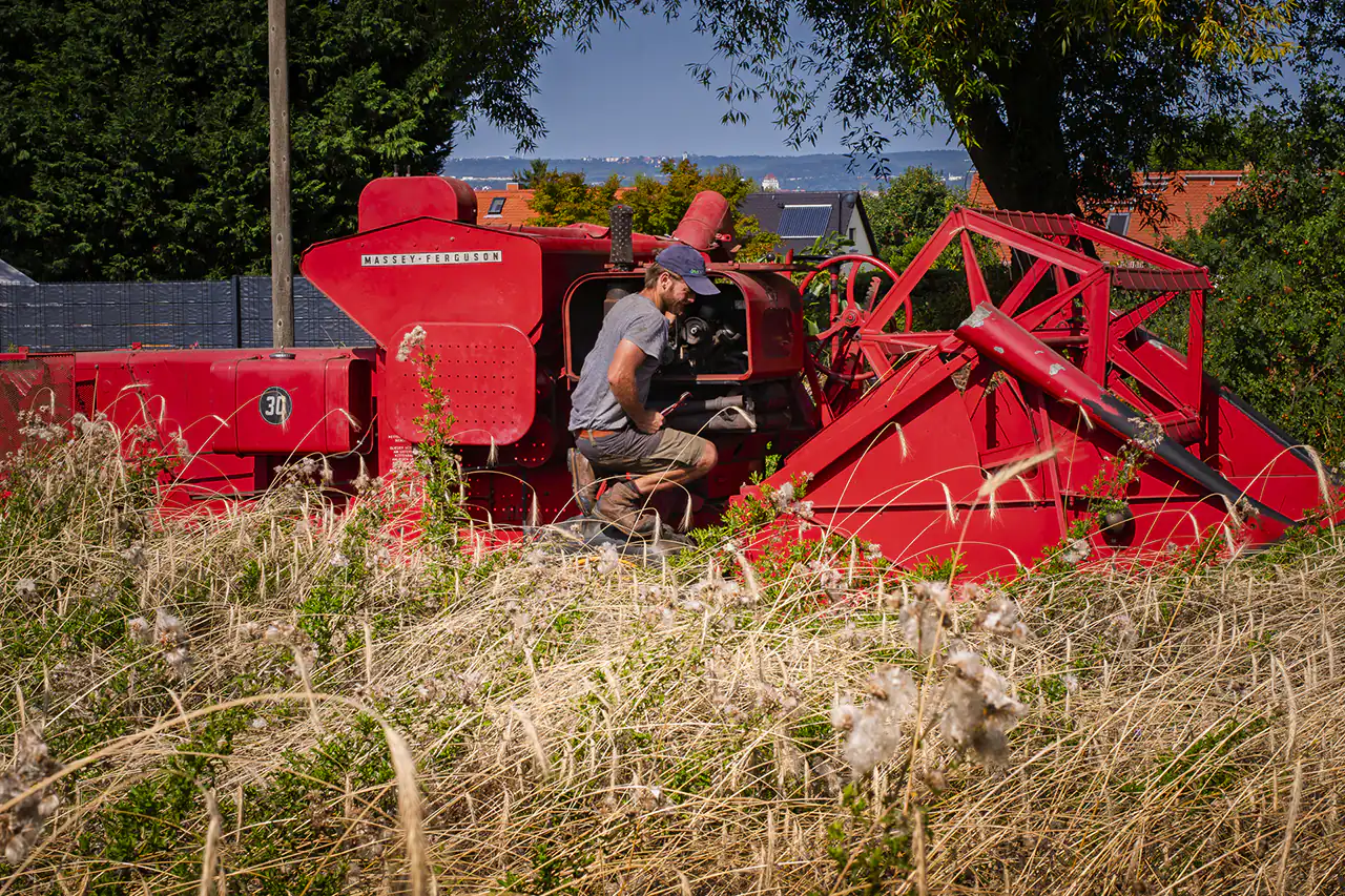 Den alten Ferguson‑Mähdrescher hat Ludwig von seinen Großeltern bekommen – eine Maschine, mit der er schon als Kind auf dem Schoss des Großvaters mitgefahren ist. Er holte sie aus dem Erzgebirge nach Dresden. Der Ferguson passt perfekt in dieses Bild: eine Maschine, deren Größe und Technik zu einem kleinen, vielfältigen Betrieb passen, nicht zu tausenden Hektar Monokultur. Sie ist ein Werkzeug, das Generationen verbindet und Wissen bewahrt.