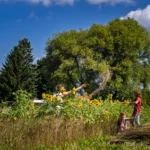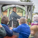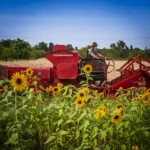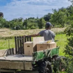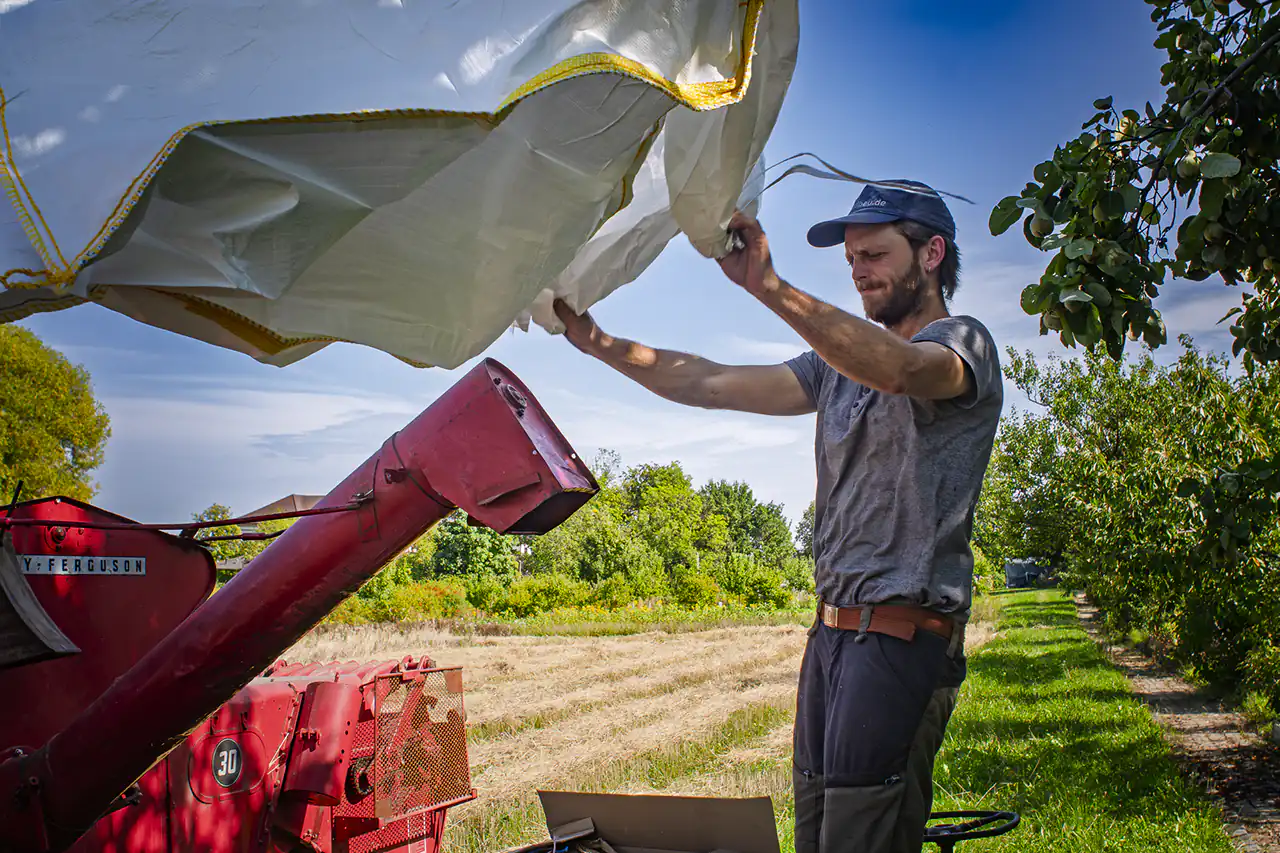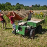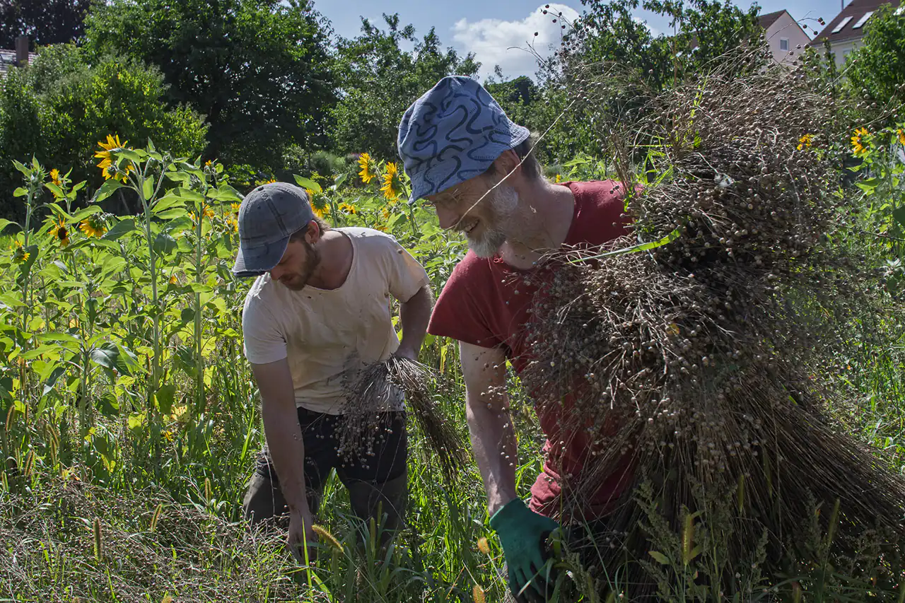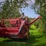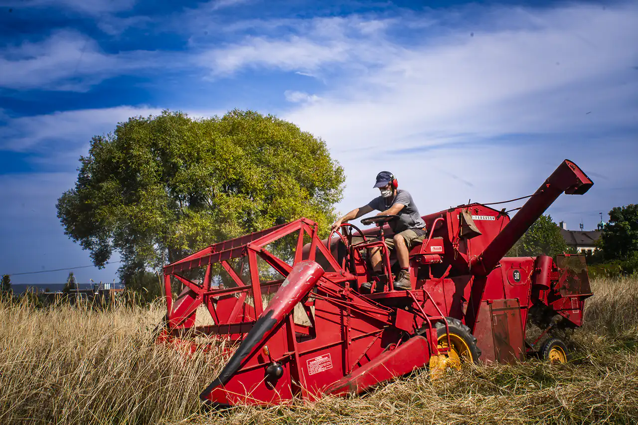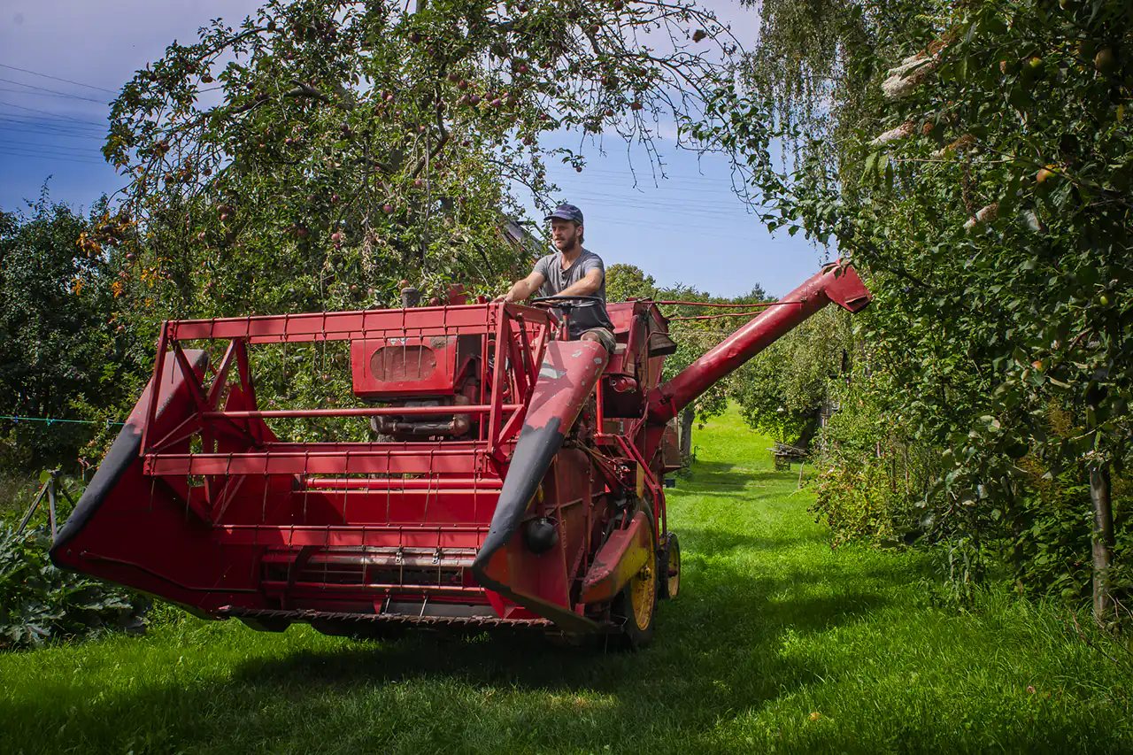 Den alten Ferguson‑Mähdrescher hat Ludwig von seinen Großeltern bekommen – eine Maschine, mit der er schon als Kind auf dem Schoss des Großvaters mitgefahren ist. Er holte sie aus dem Erzgebirge nach Dresden. Der Ferguson passt perfekt in dieses Bild: eine Maschine, deren Größe und Technik zu einem kleinen, vielfältigen Betrieb passen, nicht zu tausenden Hektar Monokultur. Sie ist ein Werkzeug, das Generationen verbindet und Wissen bewahrt.