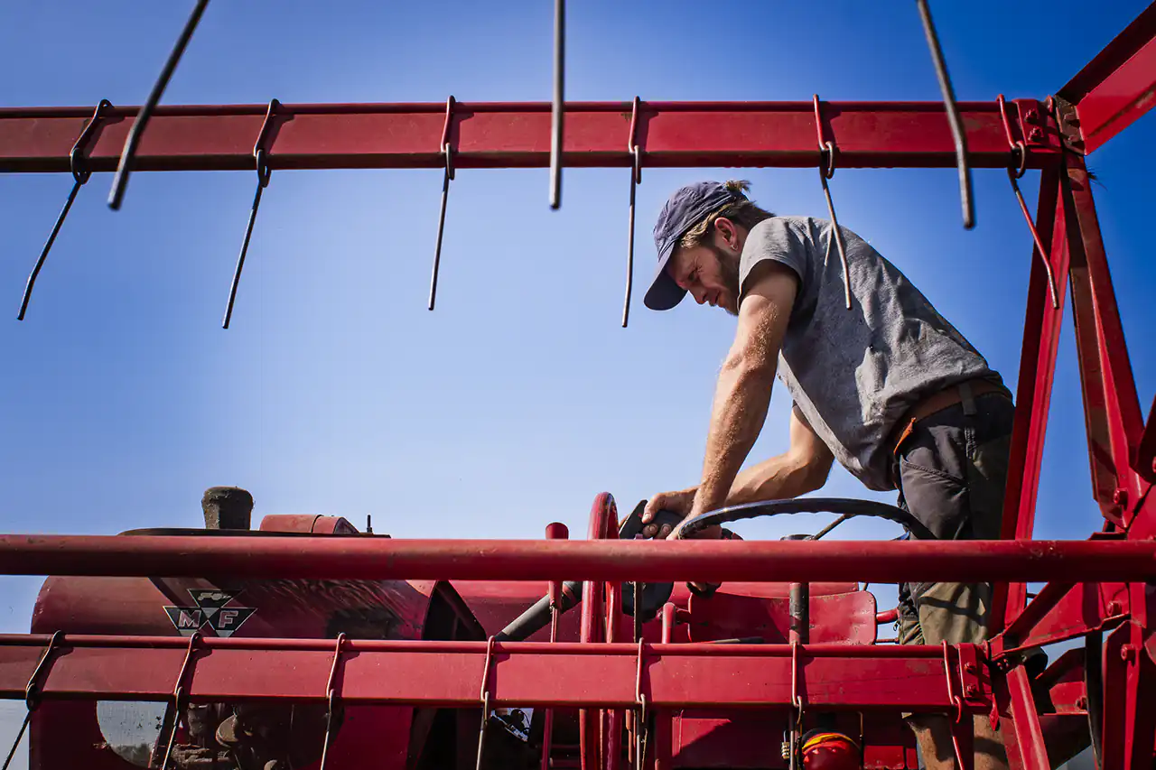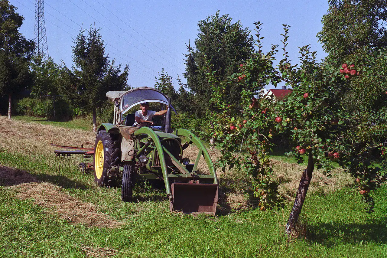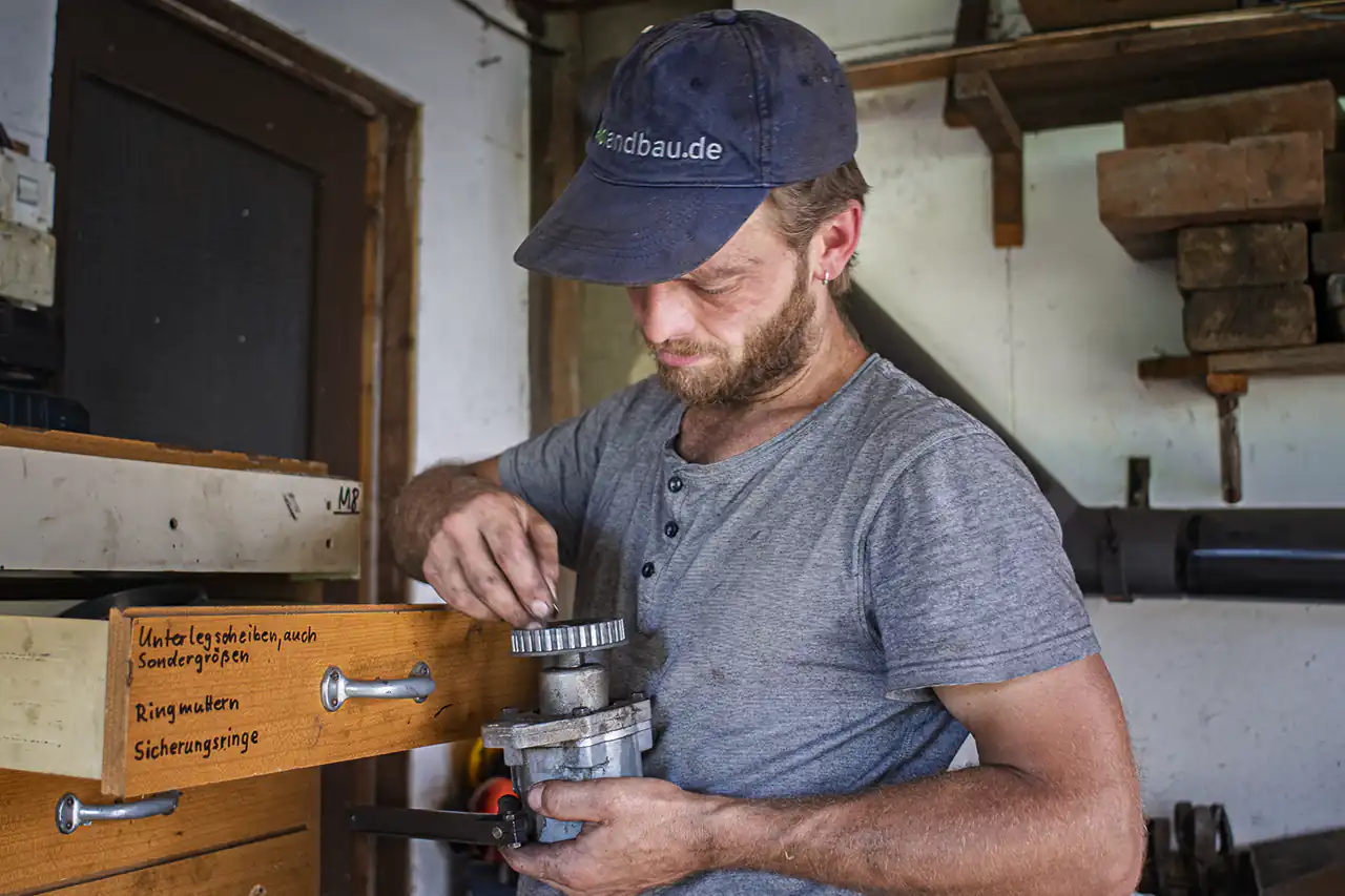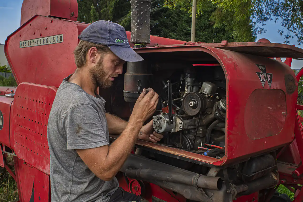 On a hot summer day, I had the opportunity to witness Ludwig harvesting grain with this machine. About half the field had been harvested when the machine suddenly stopped in the blazing sun – a technical problem in the middle of the grain field. On large farms with modern machinery, this would have meant calling in a specialist, having the machine towed away, or requesting a replacement – costly and time-consuming. Ludwig, however, ran down to his workshop in just a few minutes and returned with the right tools. He only had to wait until the machine had cooled down somewhat before he could carry out the repair in the heat. With a steady hand and great experience, he got the old Ferguson running again.