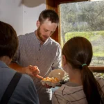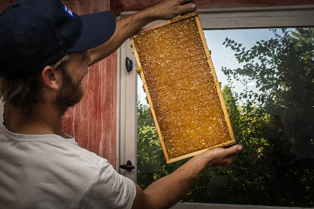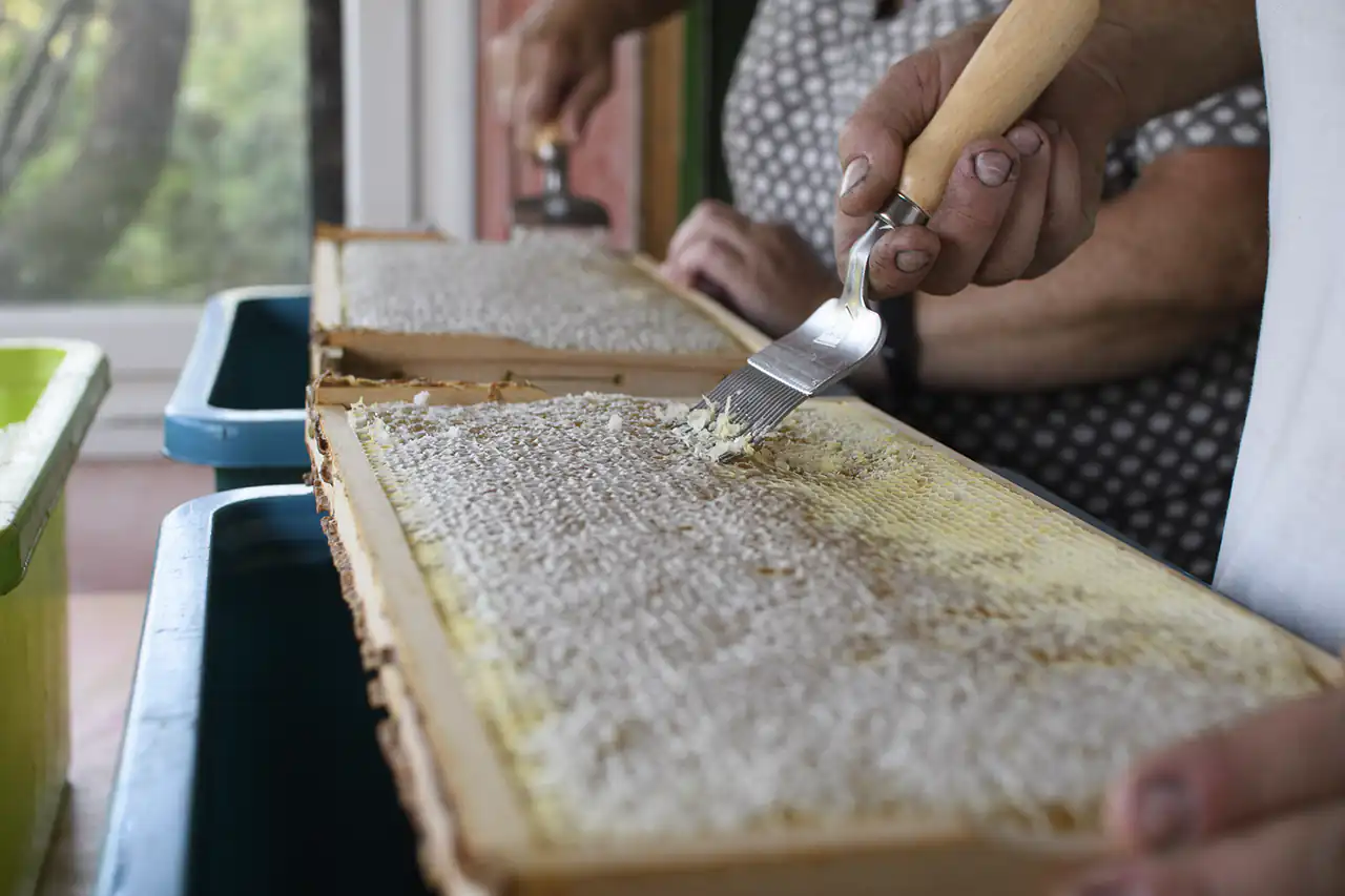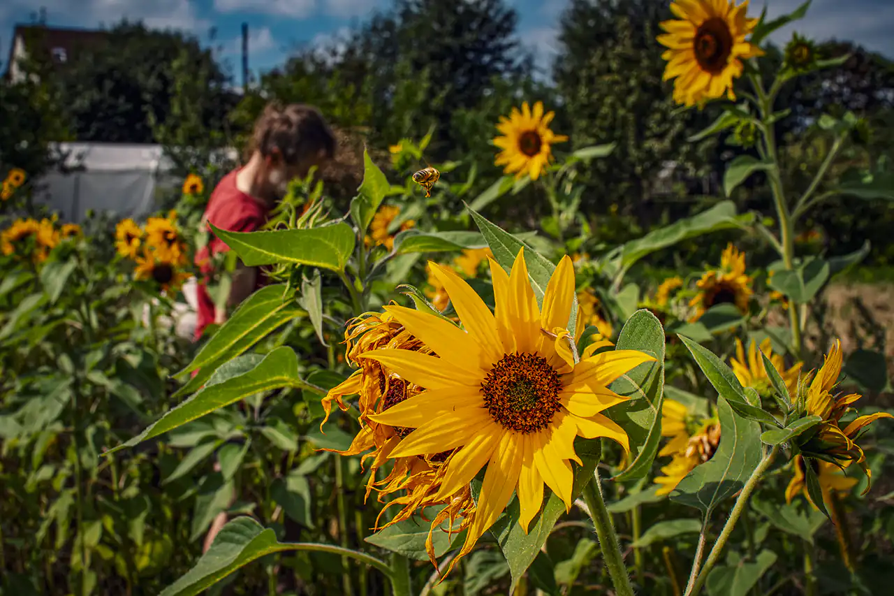 Between fruit trees and beds there are also several beehives which became the stage for a small honey harvest on a hot summer’s day that I was able to experience with my daughter. While a beekeeper carefully lifted the frames from the hive and carried them into the small extraction shed, my daughter stood a few metres away among the blackberry bushes, eating berries – safe, yet right in the middle of the action. Inside, Ludwig patiently explained how the honey extractor works, why the uncapped combs are first opened with a special fork and why the turning drum sounds like summer rain outside. When the first golden honey ran down the inside of the drum, we were allowed to taste it: it was denser, sweeter, more intense than any honey from a supermarket jar and would have been perfect on a scoop of ice cream that hot day. At the same time it became clear that the bees are not just honey suppliers, but important co‑workers, pollinating the trees and shrubs that make Wandelgrund so productive.​